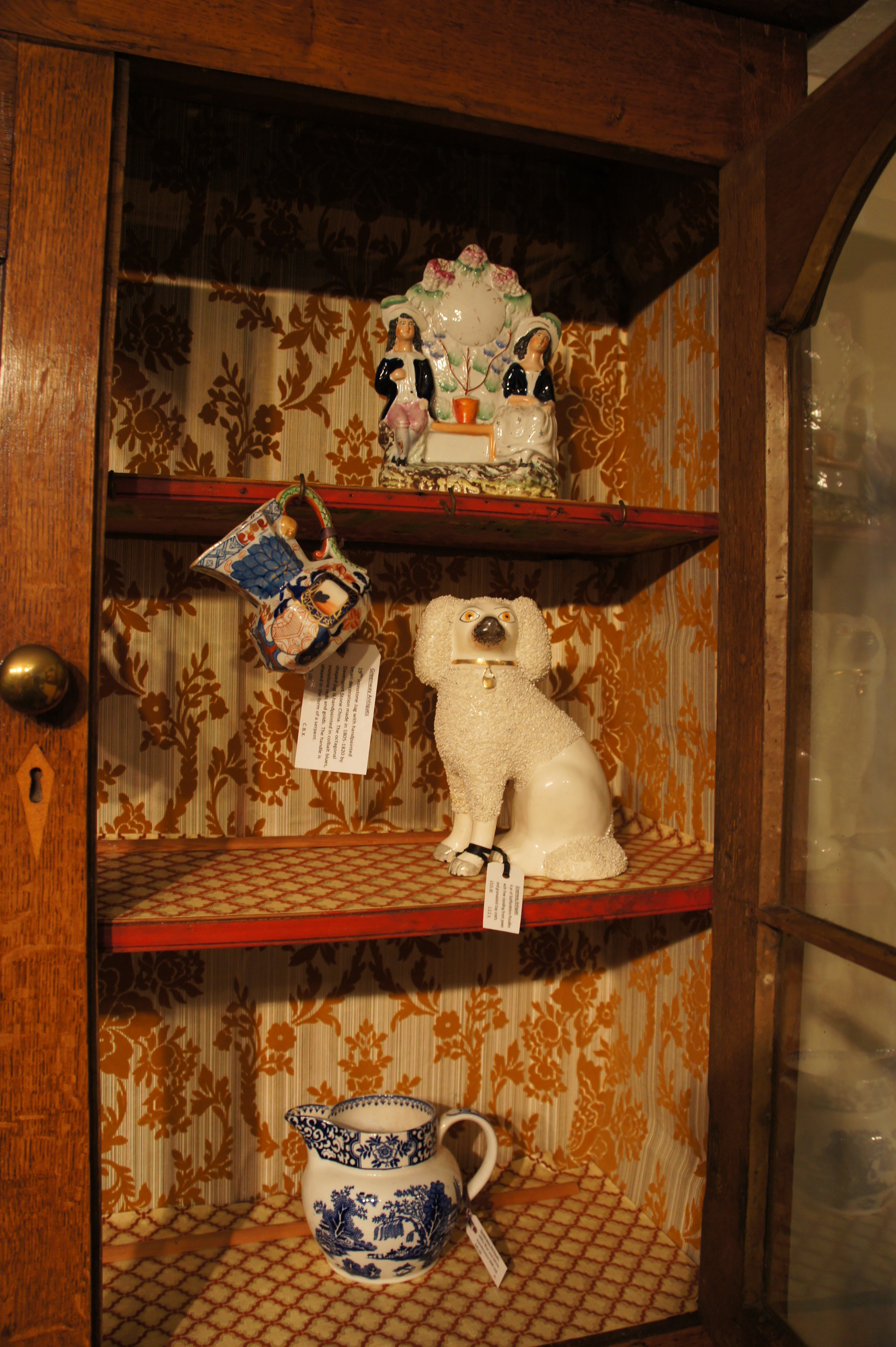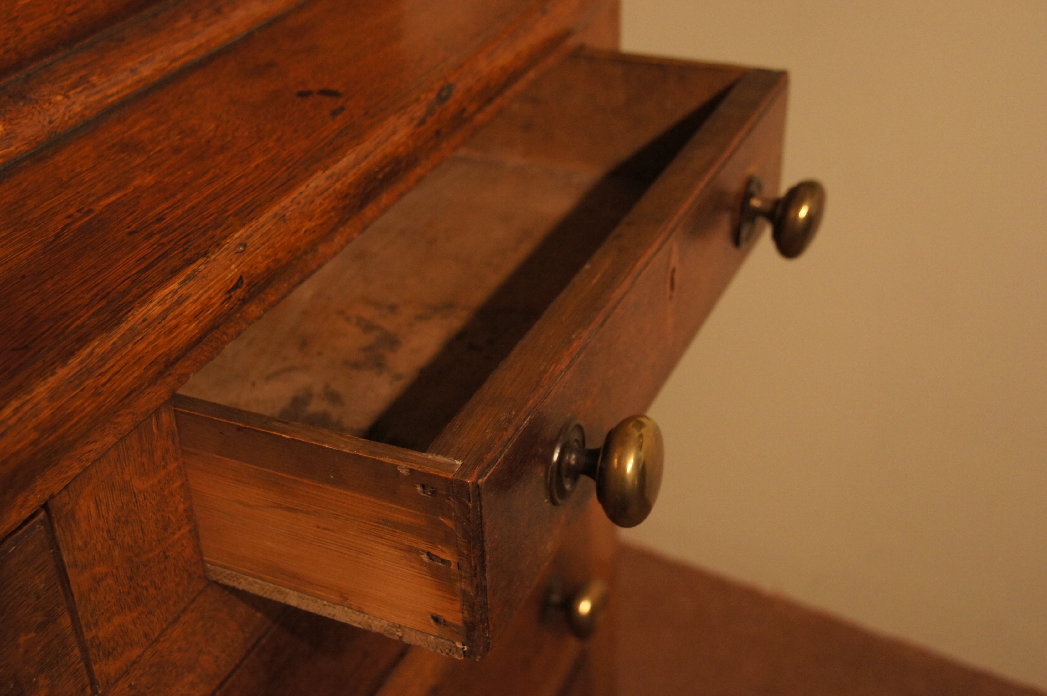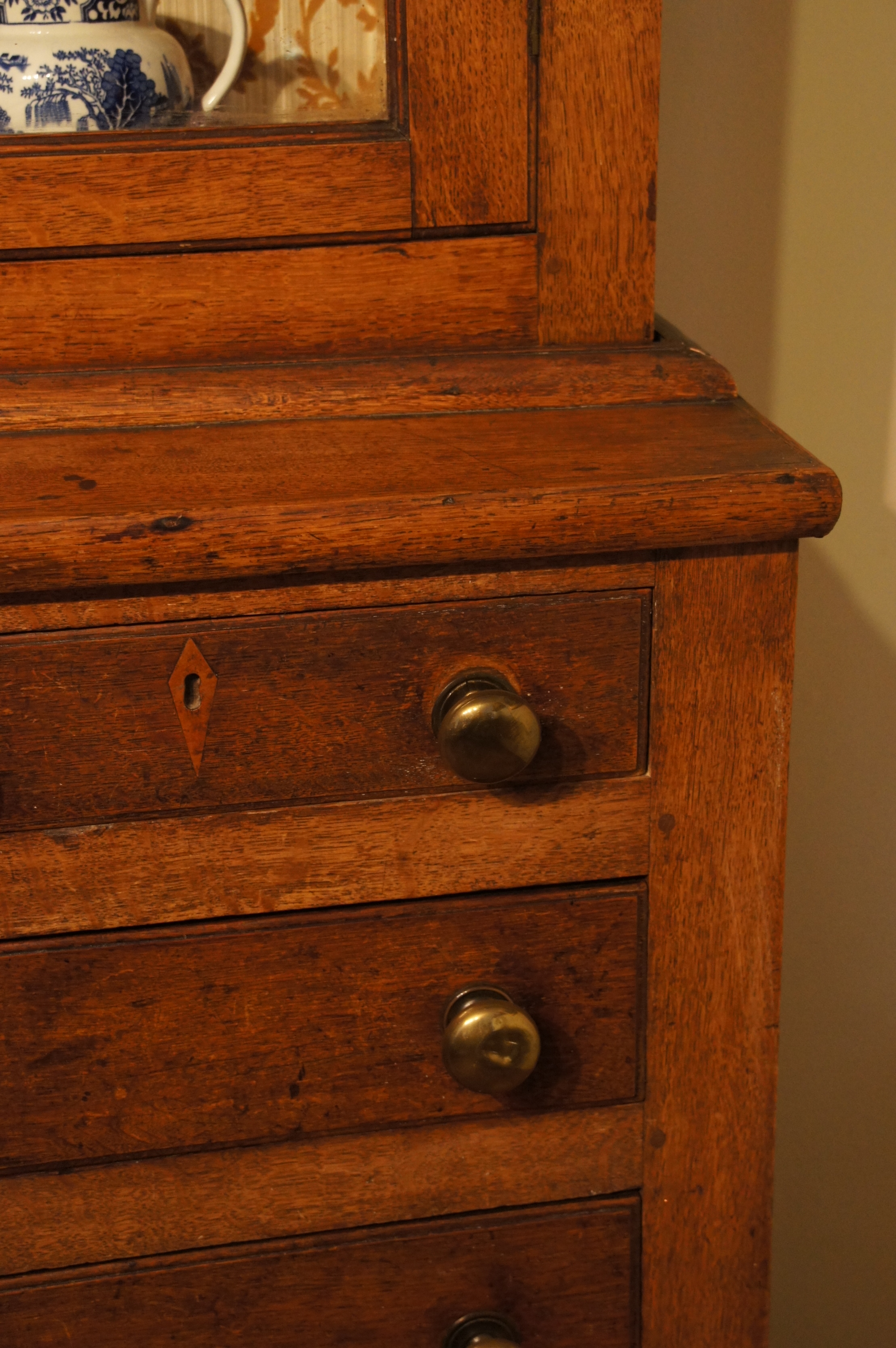 An early 19thc Cwpwrdd Gwydr (glass cupboard) in two parts with glazed display top and two shelves above a two over three graduated chest of drawers. It has a cushioned cornice over arched doors, panelled sides and attractively shaped apron at floor level.