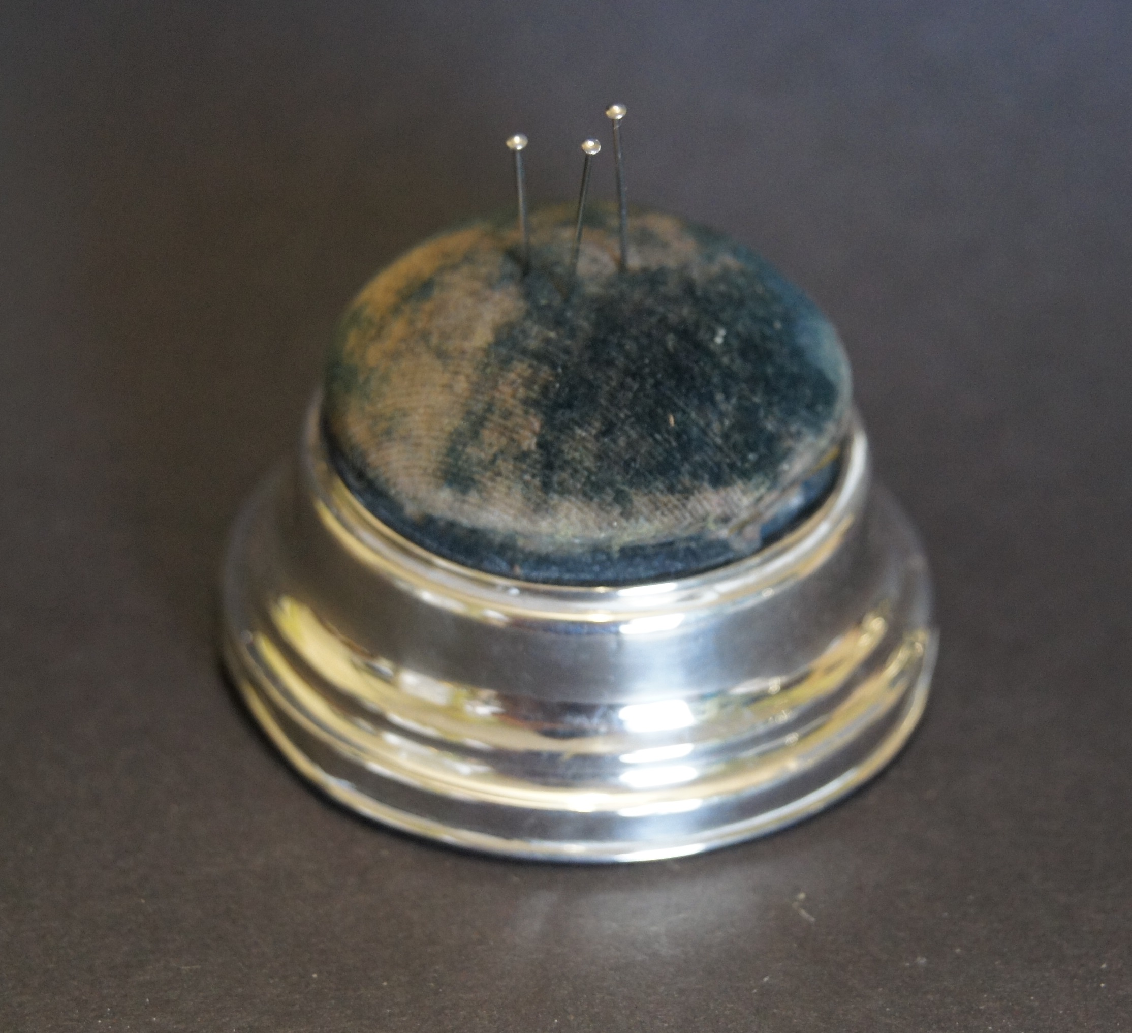 A silver ring box with a pin cushion lid hallmarked Birmingham 1897